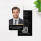 Cartões de visitas de borda curvas modernas, verticais, pretas e ouros (gradiente de cor impresso, não folha real) com seu nome e título nos campos de modelo frontal e personalizável para suas informações de contato, logotipo e código QR no verso. Você pode alterar as cores de fundo e fonte, mover e redimensionar elementos com a ferramenta design.