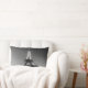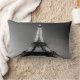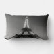 Uma almofada retangular com uma fotografia preto e branco da Volta Eiffel à deitar de sol