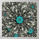Uma mandala clássica central da flor de Lotus em tons de azul e aqua, cercada por um desenho fractal preto e branco.