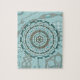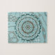 Este design de círculo concêntrico apresenta camadas de padrões brancos, turquesas e marrons inspiradas por teclas celtas e índias, como vinhas, fitas e flores de lótus.