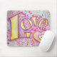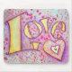 Cores d'água pintando a palavra amarela ouro "Amor" com um duplo coração. Rosa e roxo destaca as letras e o coração. Um brilho leve de brilho no topo dá à pintura um brilho brilhante.