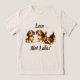 A t-shirt that says, "Love, not labs" with an illustrating of three Beagle puppies playing.