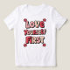 Make self-care your priority with this bold and groovy "Love Yourself First" graphic. Featuring a 70s-inspired bubble font in bright shades of pink and red, this design is a powerful and stylish reminder to always prioritize your own well-being. Surrounded by cute retro flowers, it's the perfect positive statement for anyone on a journey of self-love and empowerment.