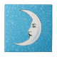 Imagem é uma lua crescente branca vintage com um rosto contra um fundo azul com aglomerados de estrelas brancas minúsculas brilhantes. Veja minha loja Art by MAR para produtos correspondentes com este design.