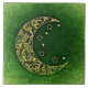 Uma lua crescente ouro em um padrão floral natural com estrelas sobre um pano de fundo verde.