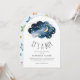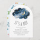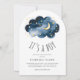 Esta Lua e Estrelas É um Convite para Chás de fraldas Meninos que apresenta um tema lua e estrelas, é ideal para uma simples celebração. A design branca moderna apresenta uma forma de nuvem de marinho azul-d-água, enfeitada com uma lua crescente amarela e estrelas dispersas.