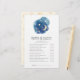 Este jogo de "mamães ou pais" neutro entre homens e mulheres é perfeito para um chá de fraldas simples. A design branca moderna apresenta uma forma de nuvem azul-aquática marinho com uma lua e estrelas amarelas com um quarto de lua amarela. Personalize a parte de trás do cartão com o nome da futura mãe e a data do chá. Você pode personalizar as perguntas do jogo clicando no botão "personalizar".