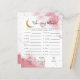 Um cartão de jogo "quem é a minha mãe?" com chá de fraldas de cor d'água, cor de rosa, com lua de ouro falsa e estrelas. Combine o nome do bebê com as mães corretas! Quem tem mais nomes, acerta, ganha! CHAVES DE RESPOSTA: 1.GOOSE=GOSLING, 2.DEER=FAWN, 3.SWAN=CYGNET, 4.ZEBRA=FOAL, 5.KOALA=JOEY, 6.SEAL=PUP, 7.PANDA=CUB, 8.WHALE=CALF, 9.PIGEON=SQUAB, 10.ALLIGATOR=HATLING 11.GORILLA=CRIANÇA, 12.CAT=KITTEN, 13.TURQUIA=POULT, 14.GOAT=KID, 15.FISH=FRY, 16.LLAMA=CRIA