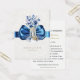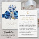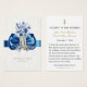 Apresentando uma bela imagem católica tradicional da imagem da Virgem Abençoada Maria, Nossa Senhora de Graça sobreposta a um arco azul, acentuada com flores azuis e um fundo branco de renda. Uma oração está atrás da noiva e do noivo. Todo texto e fontes podem ser modificados.