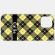 Padrão de verificação da diagonal "lumberjack" preto e amarelo pastel com cobertura de grade de ouro mate. Texto personalizável em letra branca moderna nesta capa de telefone personalizada.