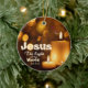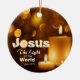 Estes enfeites de natal caracterizam o 8:12 de John do verso da bíblia, Jesus a luz do mundo. O fundo tem velas iluminadas mornas e luzes bonitas do abstrato do ouro. O cumprimento, os nomes e a data traseiros podem ser alterados aos detalhes de sua escolha.