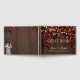 Livro de hóspedes russo com luzes de brilho branco de ouro, jarro de pedras com flores brancas (no verso) e folhas de outono ferrugem sobre fundo de madeira castanho-escura. Ideal para o outono noturno | elegante país russo | casamento temático no quintal exterior.
