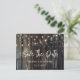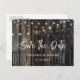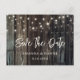 Complemente sua festa de casamento rústico country com esses cartões de save the date com luzes de corda em um fundo de madeira de celeiro.