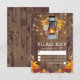Cartões de resposta de casamento rústico country com um fundo de celeiro de madeira, folhas de outono, uma lanterna acesa, luzes cintilantes e um modelo de rsvp moderno.