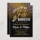Convites de festa de noivado de churrasco com luzes de cordas, guião de ouro e anéis de casamento num fundo luminoso de cordas brilhante. Este convite de churrasco apressado é facilmente personalizado para o seu evento simplesmente adicionando os seus detalhes. Você também pode alterar a cor de fundo.
