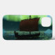 Uma imagem ligeiramente estilizada de um navio de longa distância Viking navegando à noite sob as Luzes do Norte ali um casal de icebergs; a maioria da tripulação está dormindo. A leitura de texto "VIKINGAR" (Vikings) também é exibida.