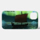 Uma imagem ligeiramente estilizada de um navio de longa distância Viking navegando à noite sob as Luzes do Norte ali um casal de icebergs; a maioria da tripulação está dormindo. A leitura de texto "VIKINGAR" (Vikings) também é exibida.