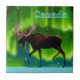 Uma imagem de um alce silenciada contra as luzes do Norte, um pouco estilizada. A leitura de texto "Canadá" aparece em azul e branco brilhantes.