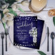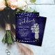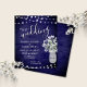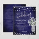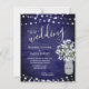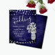 Este design de casamento acessível apresenta delicadas flores de gipsófilas em aquarela em um vaso de jarra de Mason sobre um fundo de madeira azul naval rústico com luzes de corda. Use a ferramenta de design para mais flexibilidade na modificação do texto. Variações deste design, diferentes tipos de papel, bem como produtos coordenados estão disponíveis em nossa loja, zazzle.com/store/doodlelulu. Entre em contato conosco se você precisar deste design aplicado a um produto específico para criar seu próprio item exclusivo! Muito obrigada por visualizar um DoodleLulu by 2 june bugs design!