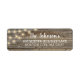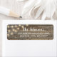 A etiqueta de remetente rústica apresenta impressão em madeira escura, luzes de corda e sobreposição de tipografia branca.