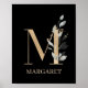 Florial do monograma da letra M. A letra M, de textura castanha ouro, acentuada com folhas compostas de cor aquosa verde, flores e pó de ouro. Personalizar com o nome na fonte correspondente.