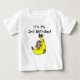 Um macaco-menina de uma banana amarela grande em T-shirts de segundo aniversário, fatos-chave, cartas, autocolantes, ímanes, sacos de tote e muito mais.