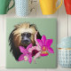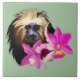 Um retrato de um macaco Leão-Leão-Leão-Cabeça-Ouro com três orquídeas fuchsia num pano de fundo verde