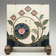 A fresh take on classic Mackintosh-inspired design, this elegant ceramic tile features stylized roses arranged like a faux stained-glass panel. Clean geometric framing, bead-chain details, and sweeping curved stems create a refined Art Nouveau look with a hint of Art Deco structure. The soft ivory background and muted palette of deep teal, sage green, and dusty blush pink are finished with warm metallic-gold outlines for a layered, dimensional effect. Perfect as a decorative wall accent, kitchen backsplash detail, bathroom feature tile, fireplace surround, or gift for lovers of vintage floral design.
