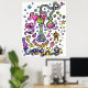 Tubos de teste coloridos brilhantes e beakers fazendo ciência louca, com bolhas que parecem globos oculares, chamas se transformando em pequenos monstros, nuvens de tentáculos de crescimento a vapor, e outros detalhes divertidos que qualquer cientista louco adoraria. Arte de Marianne O