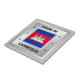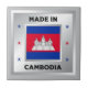The national flag of Cambodia is central to the design. There are decorative stars on either side of the flag, and they are in the colours of the Cambodian flag. The design is completed by a faux silver background.