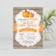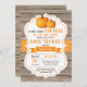Cartão de Convite para Chá de fraldas Rustic Pumpkin com fundo de madeira rusticado. Para mais personalização, clique no botão "Personalizar" e use nossa ferramenta de design para modificar este modelo.