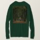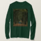 Esta camiseta apresenta uma foto digital de uma mãe e criança caminhando através de uma floresta. A mãe está vestindo um casaco bege e um cachecol, e a criança está vestindo um casaco azul e um chapéu. A floresta tem árvores altas com folhas verdes. O chão é coberto por uma camada de folhas. A design foi criada com arte generativa. A camiseta é uma camiseta verde de manga longa.