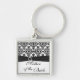 Esta chaveiro de damasco preto e branco com fita falsa e joias corresponde ao convite de casamento mostrado abaixo. Seria um presente de festa de casamento ideal, ou um encantador guardião para a sua mãe. Você pode mudar o texto para o que quiser, e pode mudar o tamanho e a forma do chaveiro. Se você precisar de assistência para personalizar isso, envie um email para niteowlstudio@gmail.com.