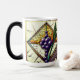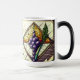 Comece o seu dia com o brilho quente e luminoso da caneca de vidro colorido "Uvas e Trigo". Esta xícara de cerâmica de alta qualidade apresenta uma ilustração exuberante que envolve toda a peça, com uvas roxas ametista profundas e hastes de trigo esmeralda vibrante, inseridas em uma moldura clássica de vidro em forma de diamante.