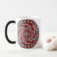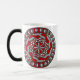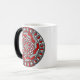 Este design de círculo concêntrico contém camadas de padrões geométricos que se assemelham a engrenagens que você pode encontrar em máquinas modernas ou até alienígenas, em tons de vermelho e cinza. Estão disponíveis outras cores e estilos de caneca, incluindo canecas de viagem e canecas de cerveja.
