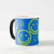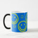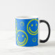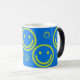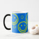 Caras múltiplas no fundo azul brilhante. O design está caracterizado na caneca morphing, azul contínuo quando o frio mas revela as caras quando quente!