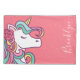 Esse design mágico de unicórnio com seus triângulos pintados de ouro é reversível, roxo de um lado e coral do outro. Adicione o nome do seu filho para personalizá-lo.
