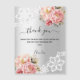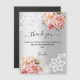Um fundo de olhar mal prateado. Decorado com rosas rosa, flores e rendas brancas. Escrita escrita com letras grandes com baloiços e o texto: Obrigado. Personalize e adicione a nota de agradecimento e o nome.