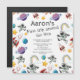 Primeiro convites de festas de aniversários do espaço externo apresentando um fundo de céu estrelado, planetas do sistema solar espalhados ao redor da borda, um foguete, astronauta, e um modelo moderno de celebração de primeiros aniversarios que é fácil de personalizar.
