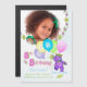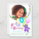 8ª festa de aniversário, convite para fotografias de manutenção magnética com nome personalizado, com uma princesa de ursos roxos sorridente, vestida com uma adorável coroa amarela e acessórios de flores rosa, azuis, amarelas e verdes segurando um monte de balões com a palavra FESTA neles. Personalizar com a foto e o nome da criança torna-a especial. A imã salve a data é um lembrete divertido no frigorífico. Design original do Anura Design Studio.