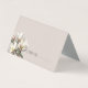 Placas de número de tabela dobradas. Flores brancas, magnólias do sul, decoram a frente das cartas cor-de-rosa bege com texto "mesa no." para usar como cartas de escolta. Remova o texto para o vazio do comprar e escreva os nomes dos convidados manualmente para cartões de lugar.