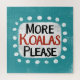 "Mais Koalas por favor" é um design de texto bonito em azul com texto preto e vermelho, junto com uma forma de sotaque branca e pontos brancos texturizados ao seu redor.
