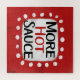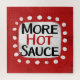 "Mais Molho Quente" é um design de texto fofo em vermelho com texto preto e vermelho, juntamente com uma forma de sotaque branca e pontos brancos texturizados ao seu redor.