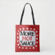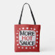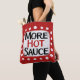 "Mais Molho Quente" é um design de texto fofo em vermelho com texto preto e vermelho, juntamente com uma forma de sotaque branca e pontos brancos texturizados ao seu redor.