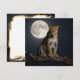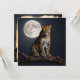 A powerful leopard with piercing yellow eyes and a sleek, spotted coat sits majestically on a stark, solitary branch. One paw dangles artfully across the center of the illustration, hinting at movement. Behind him, a vast, luminous harvest moon hangs in the inky night sky, casting an ethereal glow. Awesome blank notecard for anyone who loves leopards.