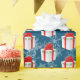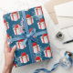 presente de Natal branco com arco vermelho e texto de Natal feliz em um fundo azul. Fundo branco de flocos de neve. A cor de fundo pode ser alterada.
