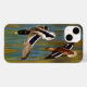 Patos-reais masculinos e femininos em voo sobre uma lagoa de ouro, água ondulando para refletir as cores da folhagem de outono de fundo brilhando à luz do sol. Trabalho de arte realista criada de uma pintura original de petróleo pelo artista da vida selvagem Crista S. Forest.
