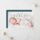 Um elegante design de anúncio de nascimento que apresenta um cheio sangrando uma foto horizontal ou orientada a paisagem com "introduzindo [name]" no topo, em blogs de caligrafia e em letras clássicas de serifa. O nome do cheio do seu bebê, estatísticas de natalidade, e a assinatura da sua família aparecem no fundo. Adicione três fotos quadradas adicionais no verso.