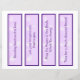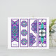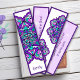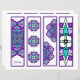 Cartões de mandala roxos e rasgados, com uma citação inspiradora no verso relacionada à leitura.