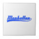 Manhattan, Nova Iorque, escrito com uma haste (cauda). Fontes em branco e azul. Design de texto original.
